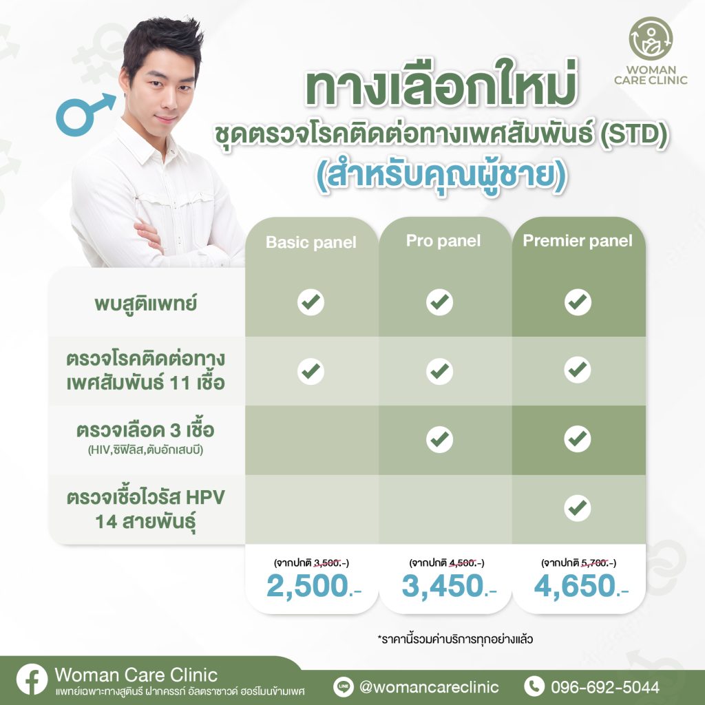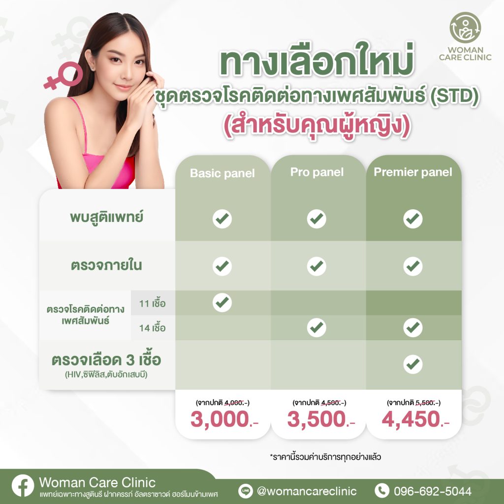 ที่ Woman care clinic มีการให้บริการตรวจโรคติดต่อทางเพศสัมพันธ์ให้เลือกหลายแพ็กเกจค่ะ ทั้งคุณผู้หญิงและคุณผู้ชาย โดยทุกแพ็กเกจจะมีการเข้าปรึกษา และตรวจร่างกายโดยแพทย์เฉพาะทาง จากนั้นจึงเลือกการตรวจ ซึ่งขึ้นกับทางเลือกที่ผู้ป่วยต้องการค่ะ